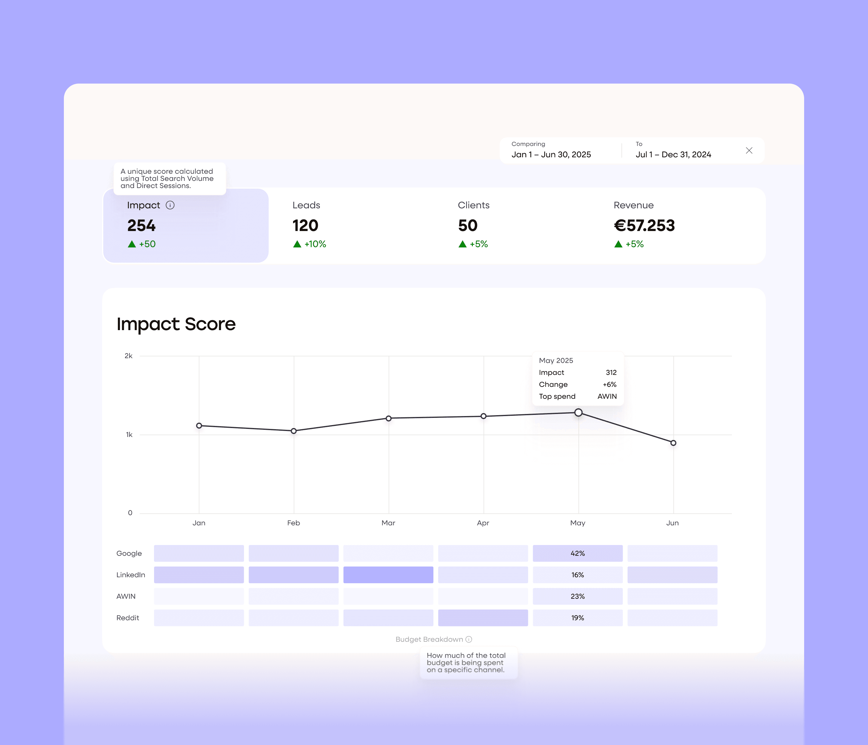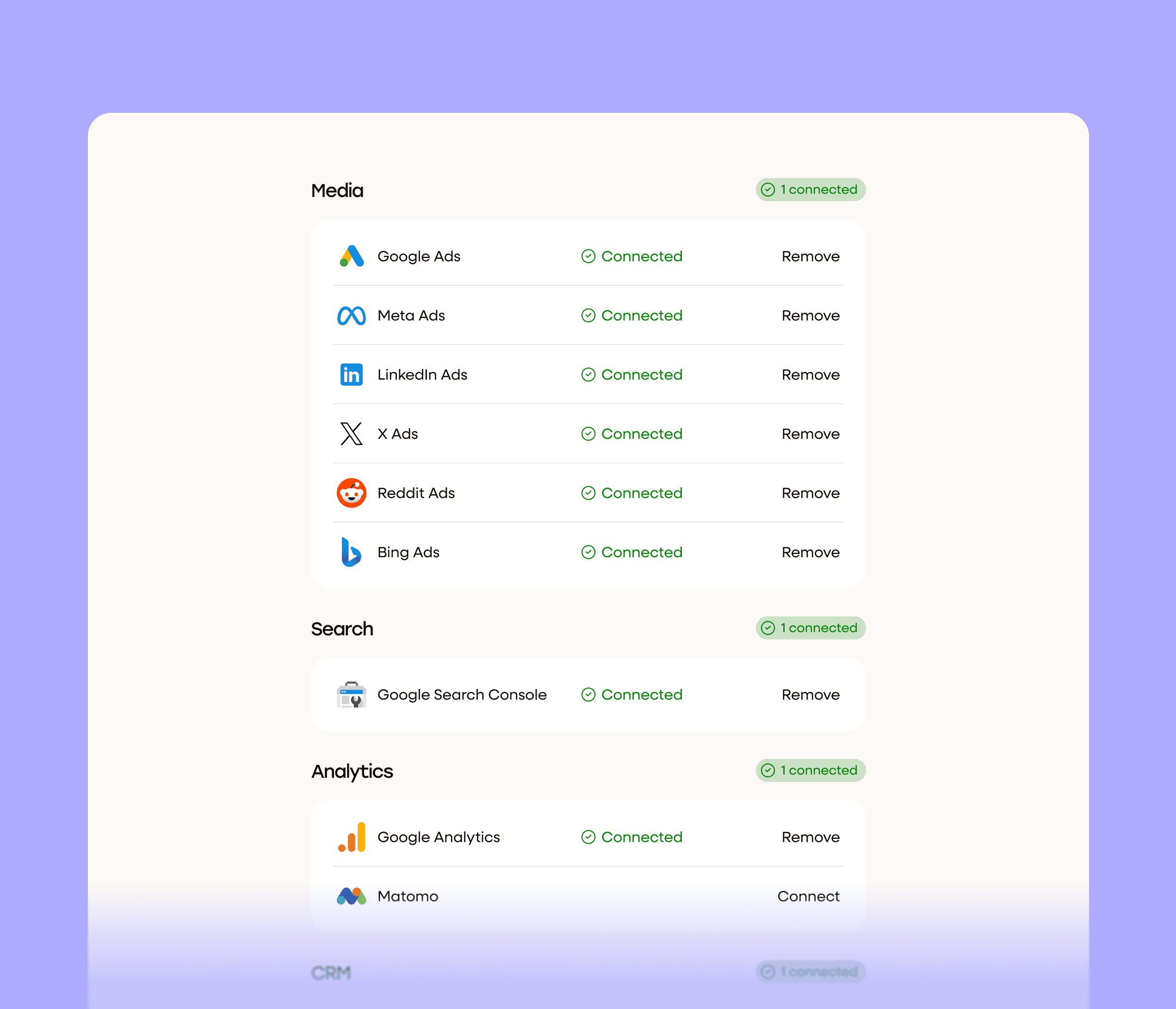 Your media platforms, search data, analytics, and CRM data—finally unified. No more tab-switching, tool-juggling, or cross-referencing spreadsheets. One source of truth. One place to act.