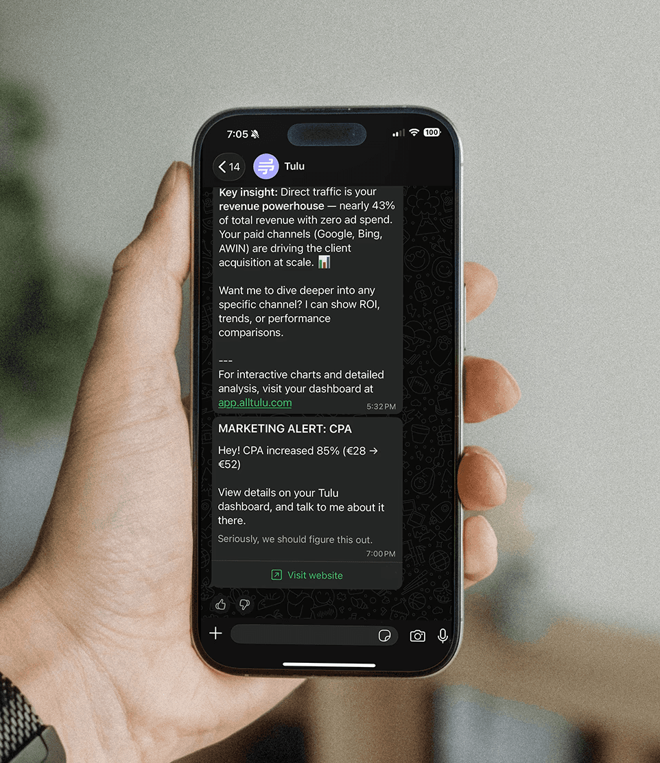 Tulu doesn’t wait for you (or your agency) to log in. When something needs attention, it comes to you—by WhatsApp, email, SMS, wherever you work. Protect from overspending, excessive pacing, and missed opportunities, without even opening your computer.