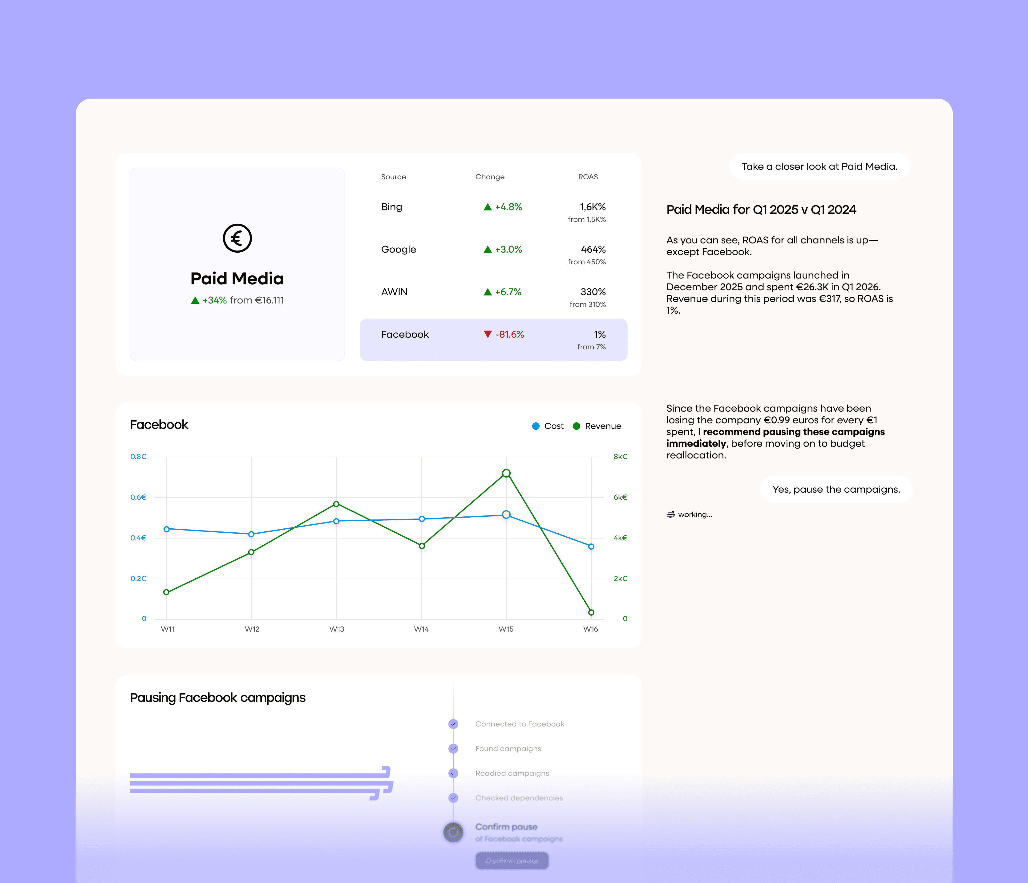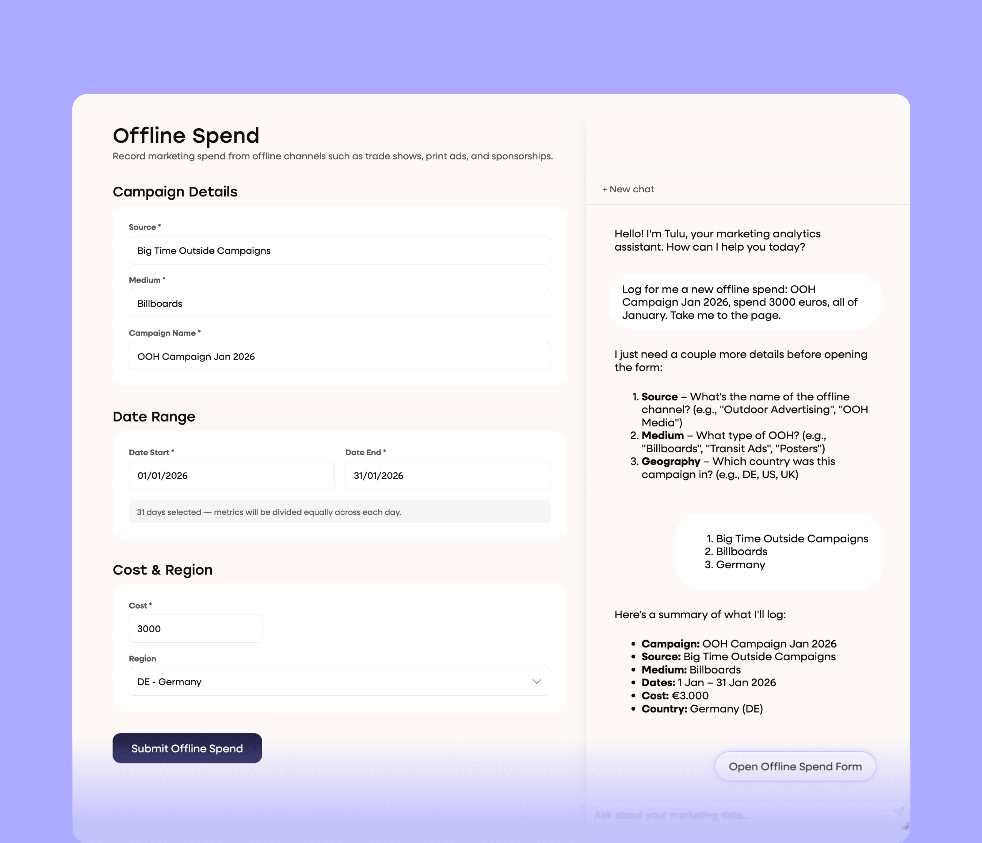 Never copy-paste into ChatGPT again. Tulu already knows your campaigns, channels, spend, and performance—full context, including all your historical data, all the time. Ask a question and get a real answer, without having to attach anything.